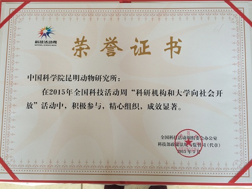 昆明动物研究所在2015年科技活动周期间,以昆明动物博物馆为主场向社会公众免费开放,同时推出“黑色精灵—怒江金丝猴”大型主题展及科普书签约仪式,此活动推进了E乐彩与怒江州林业局院地合作。 昆明动物研究所开展了一系列科普讲座、科普活动,收到了良好的社会效益,荣获全国科技周组委会和科技部政策法规与监督司表彰。