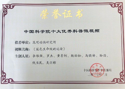 2017年2月22日至2月24日中国科学院科学传播局召开科普工作交流会,在会上对科学传播工作进行表彰,由昆明动物研究所推荐,昆明动物博物馆团队李维薇、罗杰、黄孝舸、杨劲松、马晓锋、孙羽、钱亚民、吴丽彬主创的微视频《蓝色生命线的延续》喜获中国科学院十大优秀科普微视频荣誉。
