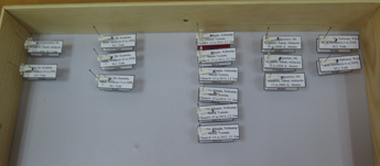 今天昆明动物博物馆昆虫标本库收到云南大学高建军副研究员移送的今年刚刚发表的的5种果蝇的模式标本,共计16号,它们分别是Dichaetophora trilobita Yang & Gao副模2号(SN003876和SN003882),采集于马来西亚;D. heterochroma Yang & Gao副模3号(SN003880、SN003881和SN003883),采集于马来西亚;D. flatosternata Yang & Gao正模1号(SN004172)、副模5号(SN004171、SN004173、SN004174、SN004175和SN004178),采集于中国;D. borneoensis Yang & Gao副模3号(SN003893、SN003894和SN003896),采集于马来西亚;D. javaensis Yang & Gao副模2号(SN003888和SN003889),采集于印度尼西亚。上述5种果蝇的其他模式标本分别存放在马来亚大学生物科学研究所动物博物馆、马来西亚沙巴公园的京那巴鲁园、马来西亚大学热带生物与保护研究所、印度尼西亚博洛尼亚动物博物馆和日本北海道大学博物馆。