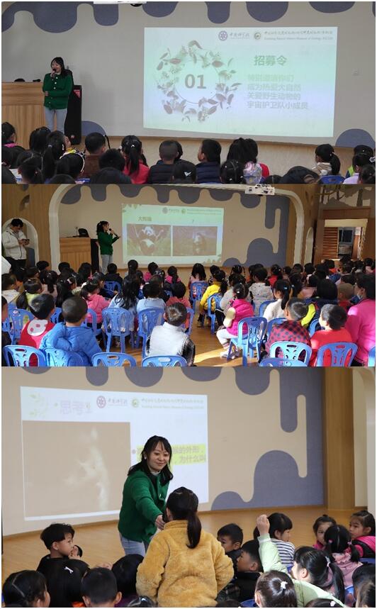 现场,孩子们纷纷在“保护生物多样性,从我做起”的宣传布上按下了自己的彩色小手印。接着,孙羽老师作了题为《雪山精灵》的趣味科普讲座,以通俗易懂的语言向小朋友们讲解了滇金丝猴的特征、习性、栖息地等科学知识,并穿插提问和互动。小朋友们争相举手回答问题,气氛活跃。讲座结束后,孙羽和云南大学的廖辰灿老师还为小朋友们讲解科普图片上的动物并回答问题。