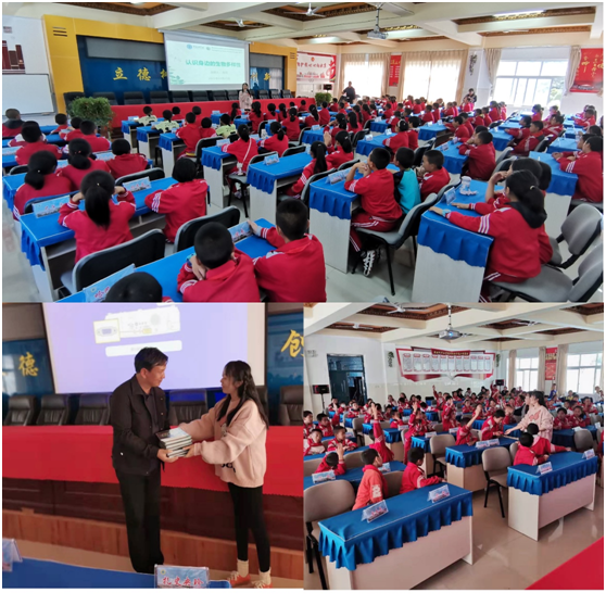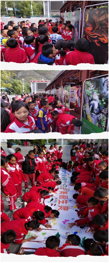 此次系列科普活动分别在德钦第三小学、普达措国家公园开展。该活动设置了科普讲座、专题展览现场讲解、图书捐赠、互动问答、绘制画卷等环节,通过“认识身边的生物多样性”主题科普讲座,以科学、互动的宣教理念和参与方式,使学生们了解什么是生物多样性,为什么要保护生物多样性以及如何保护等,讲座中穿插有奖知识互动问答,加深学生对知识的理解,增强学生们的保护意识;通过云南珍稀动物科普知识展览,以图文展板的形式,向学生宣传野生动物知识,引导学生不购买、不消费野生动物及其制品,该展览将在普达措国家公园长期展出;通过绘制“保护生物多样性 守护美丽生灵”画卷,更直观地了解多彩生物,促使“人与自然和谐共生”的美好愿景更加深入人心。此外,向全校捐赠了一批昆明动物博物馆原创的科普图书《昆虫》、《蛇》、《怒江金丝猴》、《有毒动物》,号召学生们珍惜书籍,养成勤于读书、善于读书的良好习惯。