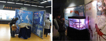 让观众流连忘返的是二楼正在展出的“鱼翔浅底——云南鱼类专题展”。在这里,首先印入观众眼帘的是展厅中央各式各样色彩斑斓的鱼儿们:他们时而闭目养神,时而嬉戏打闹,向观众淋漓尽致地展现着自己的生存智慧;旁边专题展板上深入浅出地叙述着鱼类的基本知识,如鱼类的演变、鱼类的行为与生存;云南的鱼类与研究以及鱼类文化;展板下方还陈列着部分动物所保存多年的珍贵的鱼类标本。专题展简明扼要地介绍了生活在高原水域的鱼类概况,并集中展示昆明动物所近五十年来在鱼类研究领域取得的科研成果和最新进展。观众根据自己的兴趣爱好,亲身体会,感受海洋世界的神奇美好和昆明动物所的辉煌成就。