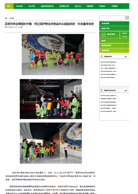 为将保护野生动物的宣传活动更深入、有效。2014年12月2日下午,昆明市林业局与动物博物馆组织昆明市云泰尚品幼儿园的小朋友到昆明动物博物馆以“树立保护野生动物意识从娃娃抓起”为主题,共同开展保护野生动物的科普宣传活动。