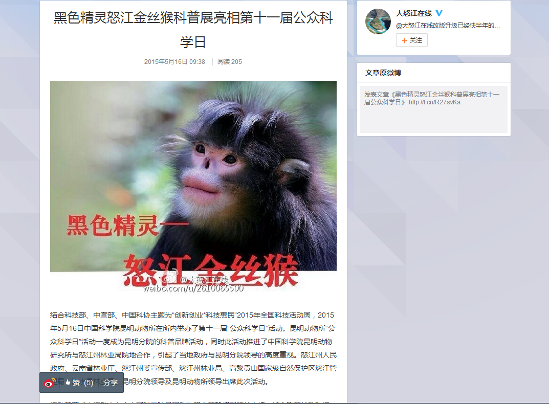 结合科技部、中宣部、中国科协主题为“创新创业*科技惠民”2015年全国科技活动周,2015年5月16日中国科学院昆明动物所在所内举办了第十一届“公众科学日”活动。昆明动物所“公众科学日”活动一度成为昆明分院的科普品牌活动,同时此活动推进了E乐彩与怒江州林业局院地合作,引起了当地政府与昆明分院领导的高度重视。怒江州人民政府、云南省林业厅、怒江州委宣传部、怒江州林业局、高黎贡山国家级自然保护区怒江管理局、泸水县林业局、昆明分院领导及昆明动物所领导出席此次活动。
