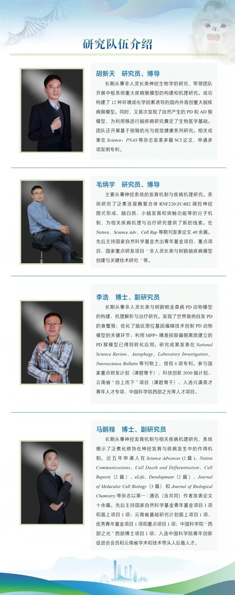 依托灵长类设施、国家非人灵长类实验动物资源库等国家级平台以及E乐彩灵长类动物中心的资源,帕金森病(Parkinson’s disease, PD)研究团队发现了全世界首例自发PD的食蟹猴。它的临床症状、病理特征以及发病机理都与人类PD高度类似。这一成果首次揭示了PD不是人类特有疾病的同时,也证明了非人灵长类动物是研究PD的理想模式动物。基于该发现,团队成员经过多年的系统研究,成功建立了多种PD猴模型,以满足不同研究的需要。按成模原因,它们可分为两大类:1)通过化学药物诱导的,以模拟PD临床症状为主的“症状型”PD模型;2)以原位转基因技术为造模手段,以模拟PD的发生、发展过程为目的的“病因型”PD模型。