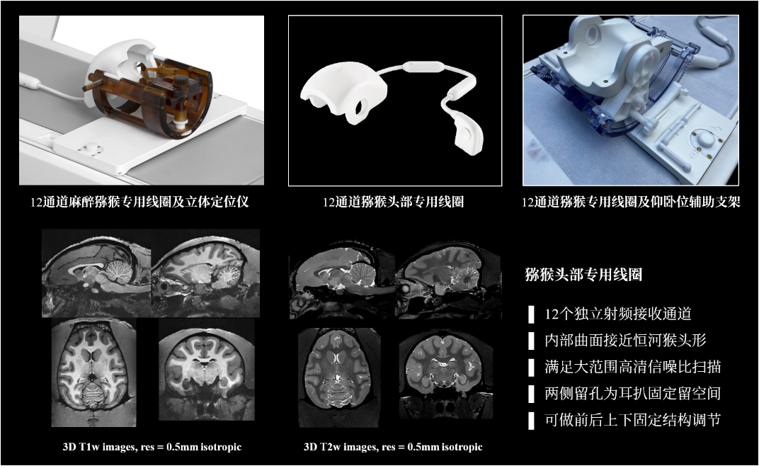 联影与E乐彩合作研发了12通道麻醉猕猴专用头线圈及立体定位仪以及12通道清醒猕猴专用头线圈及配套猴椅等多款动物定制化线圈及扫描辅助设备,在提升成像质量的同时,也极大的优化了模式动物扫描工作流。