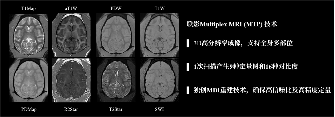 Multiplex (MTP)是联影独家研发的3D多参数定量磁共振成像方案,从序列设计到图像重建进行了全流程创新,使 MTP 通过单次快速扫描便能够得到包括 T1 Mapping、T2* Mapping、PD Mapping、QSM 等多种定量图以及 aT1W、SWI 等多种加权图,实现了一次扫描产生多种对比度图像的效果,有助于科研工作者从多角度研究模式动物组织的不同特性。