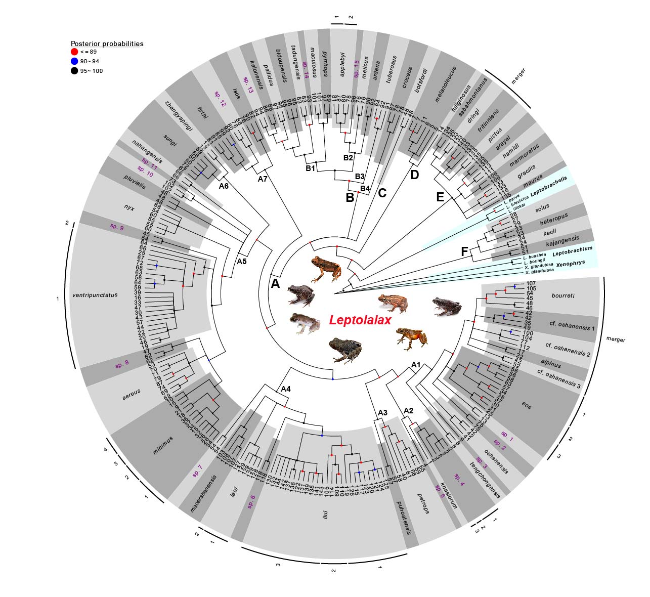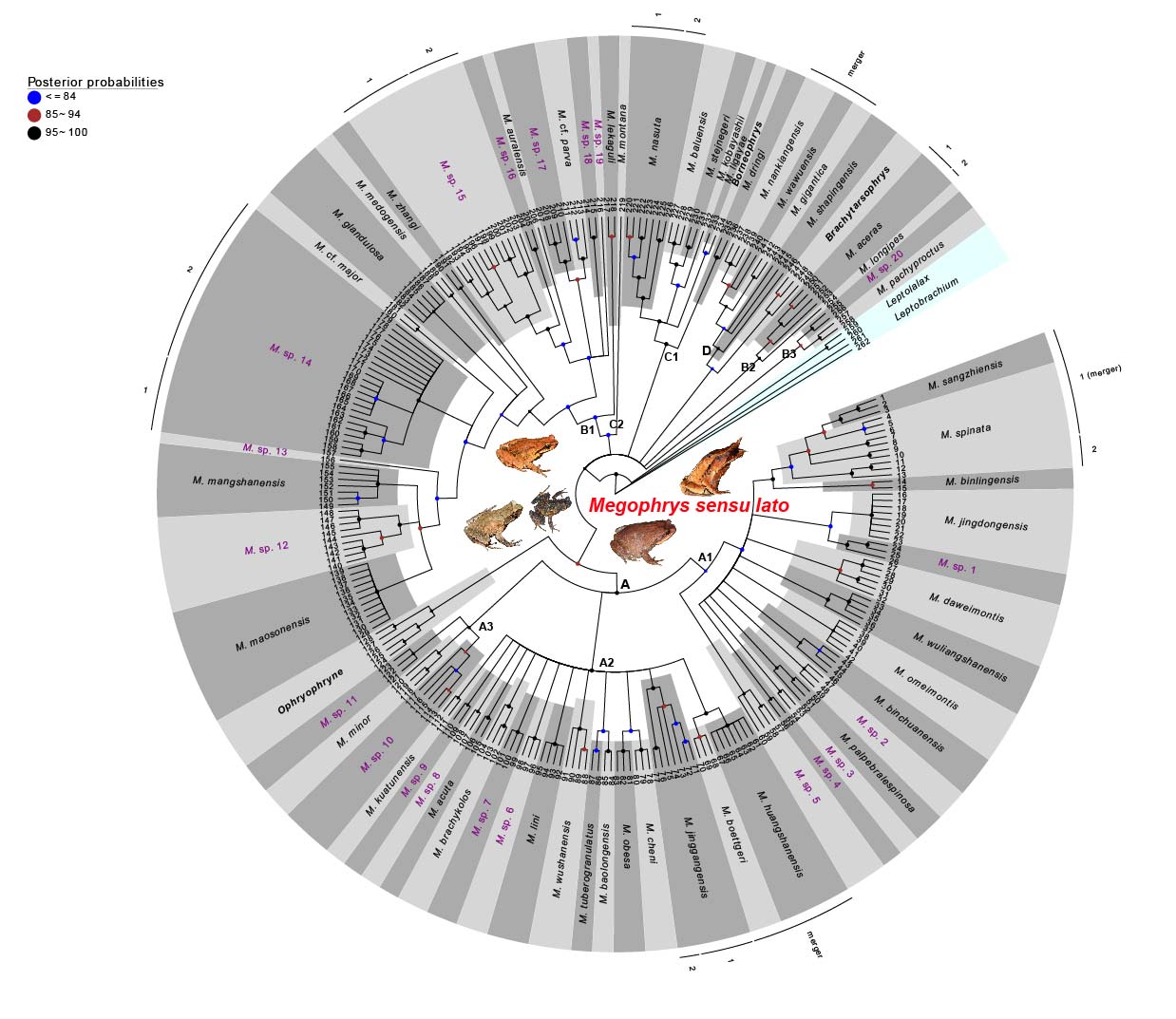 角蟾科(Megophryidae),是亚洲特有的两栖类,主要分布于中国南方,喜马拉雅山地、印度东北部和东南亚,已知物种数量超过200个。由于分布广,物种多样性高,一个囊括大部分地区、全面的物种多样性评估及分子系统发育研究极富挑战。其中,角蟾属(Megophrys sensu lato)和掌突蟾属(Leptolalax)是角蟾科中物种多样性最为丰富、分布范围最广,并且亟待调查研究的两大类群(约占角蟾科物种数量的65%)。