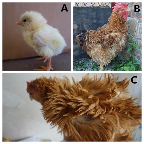 家鸡的羽毛具有丰富的表型多样性,其遗传基础一直是家鸡遗传学研究中热点。相关研究在生产中具有重要的应用价值。例如,隐性白羽性状已成为肉鸡配套系中常用的标记之一。除了羽色,羽毛在结构上也表现出多种表型。相比于正常的片羽,卷羽(frizzle)表现为羽毛翻卷(图1),在观赏鸡育种中颇受青睐。此外,卷羽还能促进家鸡散热从而提高耐热能力(heat tolerance),对改善热带高温地区家鸡的生产性能也有重要的经济价值。