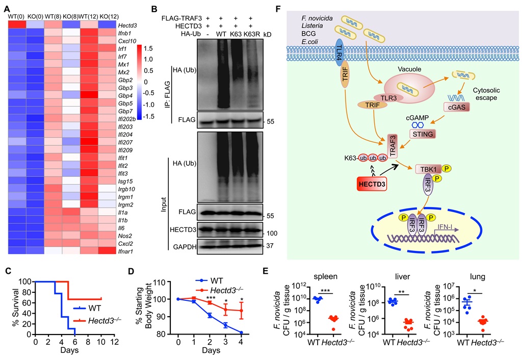 A.Hectd3基因敲除抑制F. novicida对BMDM细胞Ⅰ型干扰素及其信号通路下游靶基因的诱导表达。B.HECTD3介导TRAF3 K63链泛素化修饰。C-E:Hectd3基因缺陷型小鼠抵抗F. novicida感染。F:科学假设示意图。