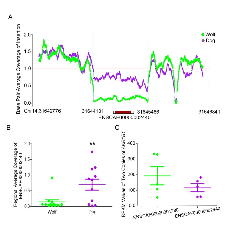张亚平院士课题组长期致力于家养动物的起源和驯化研究(1-2)。因为缺乏家犬的野生近缘种和外群的基因组,前期研究大都集中在单核苷酸多态位点(SNPs)上,而对结构变异这一类大尺度基因组变异研究甚少。结构变异包括大的插入缺失、重复、倒位、易位等,在表型多样性、疾病易感性、环境适应中扮演了重要的作用。本研究通过二代测序和基因组从头组装的方法,获得了灰狼(Canis lupus)和豺狗(Cuonalpinus)的基因组,scaffold N50 分别为6.04 Mb 和 3.96 Mb。通过对家犬、灰狼、豺狗三个犬科物种的基因组比较分析,我们得到家犬驯化特异的结构变异,包括16,315个插入, 2,565个缺失, 443个重复, 16个倒位, 和个15 易位。这些结构变异显著的影响到能量代谢、神经处理过程、和免疫系统相关的基因。更有意思的是,本研究发现家犬基因组中一个通过逆转录转座(retroposition)产生的新基因ENSCAFG00000002440,它作为AKR1B1的新拷贝在小肠和肝脏中高表达,参与脂肪的从头合成和降低高淀粉饮食带来的毒性等功能。这一发现不仅阐明了家犬从肉食性到杂食性的遗传机制,而且展示了新基因在家养动物驯化过程中的作用。本研究为家养动物的驯化研究提供了新的思路和视角。