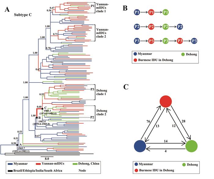 图1. 云南省境内的缅甸籍IDUs在HIV-1跨中缅边境传播中的作用。(A) 基于中缅边境地区HIV-1 C亚型基因序列构建的最大可信分枝进化树;(B) 云南省境内缅甸籍IDUs参与的跨境传播模式图;(C) 基于最大可信分枝进化树的中缅边境地区HIV-1跨境传播频数统计。