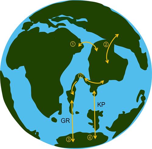 图1. 冈瓦纳古陆解体后(88-55 Ma),印度板块以及南极-澳大利亚-新几内亚板块与其他大陆之间可能存在的陆桥。(①非洲与印度的陆桥;②亚洲、印度、马达加斯加之间的陆桥;③南极-澳大利亚-新几内亚板块通过Gunnerus Ridge(GR)与印度板块相连;④南极-澳大利亚-新几内亚板块通过Kerguelen Plateau (KP)与印度板块相连。)地图改自Briggs(2003)和Bossuyt et al.(2006)。