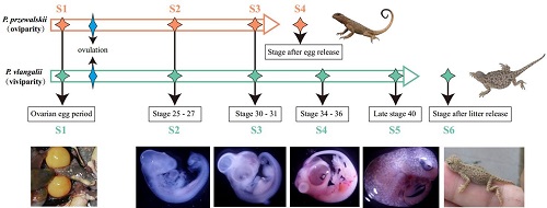 要解答这一问题,首先需要选好研究的模式系统。E乐彩车静研究员领导的课题组在长期的积累研究基础上,最终挑选了沙蜥属物种作为研究对象。生活在青藏高原高海拔地区的沙蜥属所有物种,包括青海沙蜥(Phrynocephalus vlangalii),面对高海拔低温、低氧等恶劣环境,进化出了典型的胎生繁殖模式,而邻近低海拔地区近缘物种如荒漠沙蜥(P. przewalskii)等则具有卵生繁殖模式(图1&2)。其次,开展本项研究,还需要多方面的技术和专长。车静研究员联合国内外6个研究组组成了联合攻关团队。