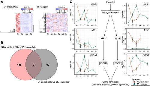 图3. 卵壳腺退化相关基因的表达模式。(A)荒漠沙蜥卵壳腺形成时期(S1)特异高表达基因在两物种的表达丰度热图;(B)两物种卵黄生成期(S1)特异高表达基因的比较;(C)已报道与卵壳腺形成相关的关键基因在两物种中的表达模式。