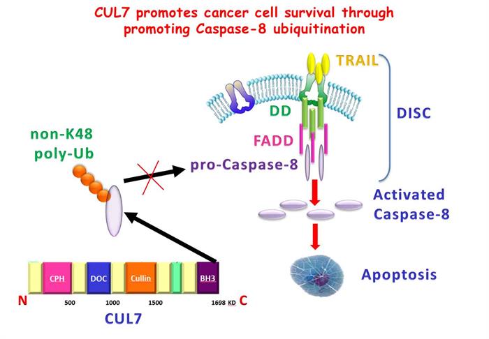 陈策实研究员领导的肿瘤生物学课题组经过研究,发现E3泛素连接酶CUL7具有促进乳腺癌和宫颈癌细胞生存的功能,抑制CUL7表达使肿瘤细胞对诱导凋亡的TRAIL、TNFa、FasL等更加敏感。进一步机制研究发现CUL7通过与Caspase-8蛋白相互作用促进Caspase-8非K48链的多聚泛素化修饰,从而减少其被招募活化。本研究揭示了CUL7在肿瘤细胞过表达可以通过泛素化修饰Caspase-8抑制死亡受体诱导的凋亡途径活化。