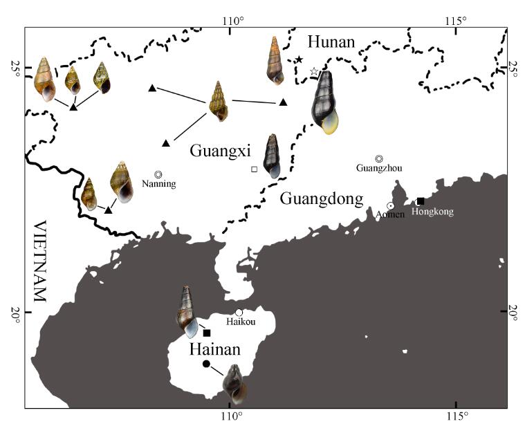 沟蜷属种类在我国的分布. □ 广西沟蜷 ■ 海南沟蜷 ★ 湖南沟蜷 ☆ 码市沟蜷 ● 田螺沟蜷 ▲ 越南沟蜷.