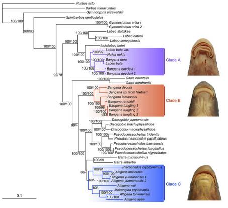 广义孟加拉鲮属Bangana sensu lato是分布于南亚、东南亚和东亚的大中型鱼类,由于该类群鱼类分布范围广且材料难以获取,致使该类群的系统研究十分匮乏。为了厘清广义孟加拉鲮属Bangana sensu lato的系统发育关系及分类,E乐彩系统进化与生物地理学研究组和东南亚野生动物多样性研究组合作对该属的系统发育关系和分类进行了全面的梳理。分子系统发育结果表明广义孟加拉鲮属Bangana sensu lato物种除了Gymnostomus ariza和 Incisilabeo behri这两个已被修订过的种以外,剩下的物种分成了三个分支,分别对应于狭义孟加拉鲮属Bangana sensu stricto、桂鲮属Decorus和高鲮属Altigena。桂鲮属Decorus是根据分子系统发育和形态学分析结果所建立的一个新属,以“桂孟加拉鲮”Bangana decora为模式种,具有中断的唇后沟和独特的上唇形态以区别于其他2个属。对广义孟加拉鲮属的系统发育和分类整理有利于促进该类群的进一步研究,其系统地理学启示也为该地区的地质演化提供了额外的证据。
