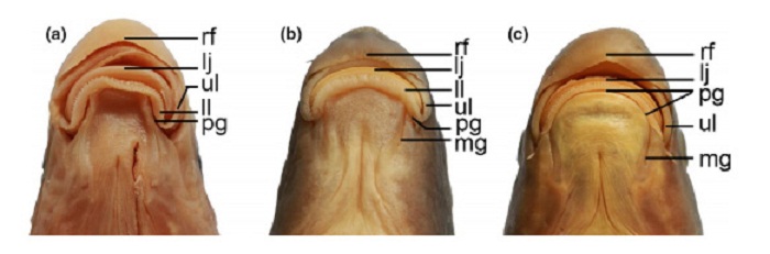 图2.广义孟加拉鲮属口唇结构:(a)Bangana devdevi; (b)Decorus decora;(c)Altigena wui.