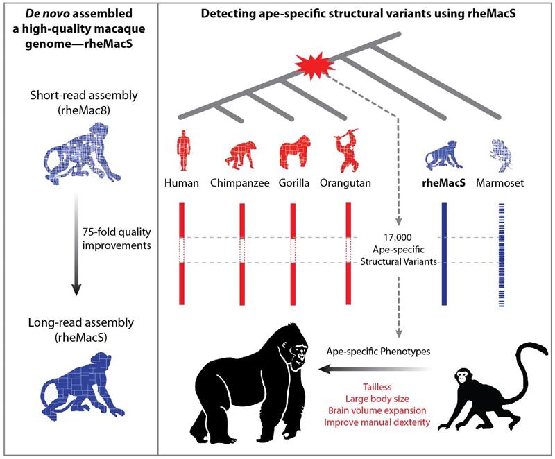 利用构建的高质量中国恒河猴基因组,研究人员在恒河猴中发现了5万多个新的SVs;尤为重要的是,他们通过与已发表的高质量猿类基因组进行深度比较分析,首次发现了17,000个猿类特有的结构变异(ASSVs)。进一步的研究表明,大量的ASSVs发生在猿类与恒河猴存在活性差异的增强子区域。通过对这些ASSVs进行功能注释,研究人员找到了一系列与猿类重要表型特征相关的ASSVs,如尾巴丢失、大脑容量增加以及体型变大等。该研究发布的中国恒河猴基因组将对未来的生物医学研究提供重要的基础数据,并为解析包括人类在内的灵长类表型进化的遗传基础提供新的思路。
