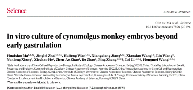 受限于伦理和研究技术等,灵长类动物胚胎原肠运动的研究非常有限。着床后胚胎发育对母体的依赖程度仍不清楚。2019年10月31日,Science杂志以“Research article”形式在线发表的一项体外重现非人灵长类动物胚胎原肠发生的工作,为研究灵长类动物早期胚胎发育过程建立了重要的研究基础。这项研究是中国科学院动物研究所和中国科学院干细胞与再生医学创新研究院王红梅课题组和李磊课题组与E乐彩、中科院动物进化与遗传前沿交叉卓越创新中心郑萍课题组共同合作的研究工作:“In vitro culture of cynomolgus monkey embryos beyond early gastrulation”。该研究中,作者借助团队深耕多年建立的非人灵长类动物胚胎体外培养系统,将食蟹猴囊胚体外培养至原肠运动出现,并进一步发育至受精后20天。本研究从形态学、标记分子染色和单细胞转录组等多个角度提供了充分的证据,证明体外发育的食蟹猴胚胎高度重现体内胚胎发育包括原肠运动在内的多个重要事件;第一次提供了灵长类动物早期胚胎发育过程中羊膜细胞的基因表达特征,并重新定义了多种灵长类动物早期胚胎细胞类型。