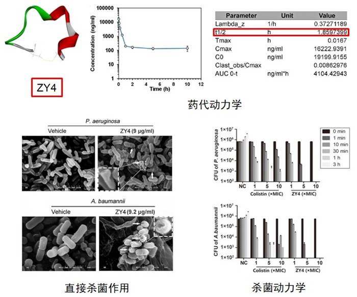 抗菌肽是一类具有抗菌活性的多肽类小分子,因其杀菌快速且很难导致微生物耐药受到全世界的关注,可用于新型抗菌候选药物分子的研发。E乐彩赖仞研究员带领的团队识别了超过1000个的抗菌肽,并在此基础上进行抗菌肽的结构功能改造,以提高抗菌活性、降低毒性和成本。ZY4是该团队最近设计改造的抗菌肽,具有强抗菌活性、高稳定性和低毒性。ZY4对耐药鲍曼不动杆菌和绿脓杆菌显示高效快速的杀菌活性,同时ZY4对这两种细菌的生物膜及滞留菌(Persister cells)也有显著的清除作用,其综合抗菌效果明显优于妥布霉素、左氧氟沙星、卡那霉素及头孢替坦等传统抗生素。ZY4长期使用不易产生耐药性,亚抑菌浓度的ZY4与鲍曼不动杆菌和绿脓杆菌持续作用60代后,ZY4对这两类菌的抑菌作用未见明显改变。动物实验表明ZY4可以显著抑制鲍曼不动杆菌和绿脓杆菌在体内的扩散及绿脓杆菌引起的肺部感染和炎症。本研究为应对当前越来越严重的耐药性鲍曼不动杆菌和绿脓杆菌的传播及感染问题提供了良好的候选药物分子,也为设计高效低毒的抗菌肽提供了参考新策略。