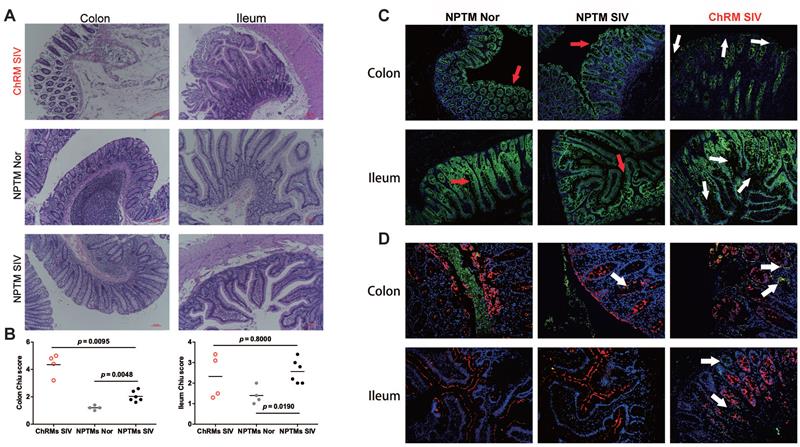 图1. SIVmac239感染北平顶猴维持良好的肠道完整性. 正常及SIVmac239感染北平顶猴和中国猕猴结肠/回肠HE染色图(A),Chiu评分(B),紧密连接蛋白claudin-3(绿色,C)及E. coli(绿色,D)免疫荧光染色图。