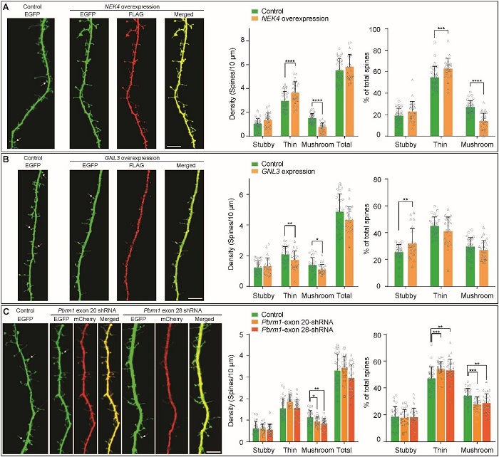 我们首先综合分析了包括精神分裂症、双相情感障碍和抑郁症等精神疾病的大规模基因组数据和人脑组织转录组测序数据,重点关注了过往GWAS中报道与这些疾病均显著相关的染色体3p21.1区域。我们在染色体3p21.1区域内鉴定出大量能够显著增加多种精神疾病发生风险的独立遗传变异,如rs2251219和rs4481150等。我们进一步发现这些变异的风险等位基因均与大脑中NEK4,GNL3基因表达的上升,以及RBRM1基因表达的下降显著相关。值得注意的是,上述变异的精神疾病风险等位基因也对应更差的认知水平和较低的大脑活跃程度。更为重要的是,当我们在体外培养的神经元中分别过表达NEK4,GNL3基因,或敲降PBRM1基因时,这些神经元呈现出蘑菇状树突棘密度的显著下调。鉴于蘑菇状树突棘已被证实在突触传递和认知功能中起关键作用,其密度的降低很有可能是不同精神疾病所共享的一个病理变化过程。这些数据形成了一个完整的证据链,一方面进一步证实了染色体3p21.1区域在精神疾病发生及相关表型中的关键作用,另一方面也为解析其对疾病发生的具体影响提供了线索。