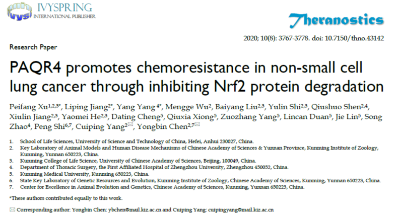 Peifang Xu, Liping Jiang, Yang Yang, Mengge Wu, Baiyang Liu, Yulin Shi, Qiushuo Shen, Xiulin Jiang, Yaomei He, Dating Cheng, Qiuxia Xiong, Zuozhang Yang, Lincan Duan, Jie Lin, Song Zhao, Peng Shi, Cuiping Yang, Yongbin Chen. PAQR4 promotes chemoresistance in non-small cell lung cancer through inhibiting Nrf2 protein degradation. Theranostics. 2020. 10(8): 3767-3778.