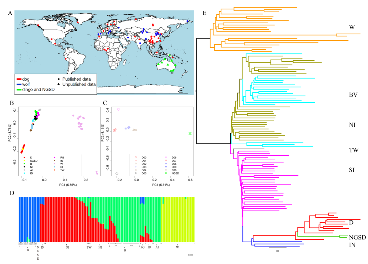 澳洲野犬(Canis lupus dingo)英文名dingo,分类学上属于犬属,灰狼种,澳洲野犬亚种,是澳大利亚特有的一种野生动物。它也是一种非常有趣的动物,首先,它生活在与外界孤立的澳大利亚,却不是澳洲的原生物种,由于澳洲的特殊地理位置,澳洲野犬只会是人类迁移澳洲携带过去的,因此研究澳洲野犬的群体历史还能反映澳洲古代人群的迁移。另外,它原先已被人类驯养,但到达澳大利亚后又脱离人类控制,重回野生环境,经过了至少五千年的野化,而且,澳大利亚长期没有其他犬科动物,dingo的野化不会受到狼或家犬的杂交,这些使得它成为研究野化最好的模型。但是目前澳洲野犬的全基因组研究还是一片空白。中科院昆明动物研究所张亚平院士,毛炳宇研究员和瑞典皇家理工学院的Peter Savolainen教授团队合作,对澳洲野犬的起源和野化过程进行了深入的研究。
