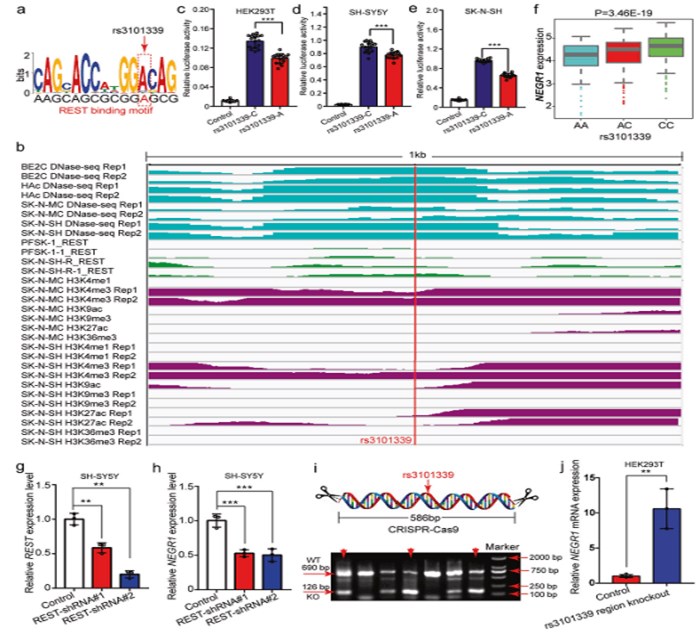 图1. 抑郁症风险功能遗传变异rs3101339可能通过影响与REST转录因子结合调控NEGR1基因表达。