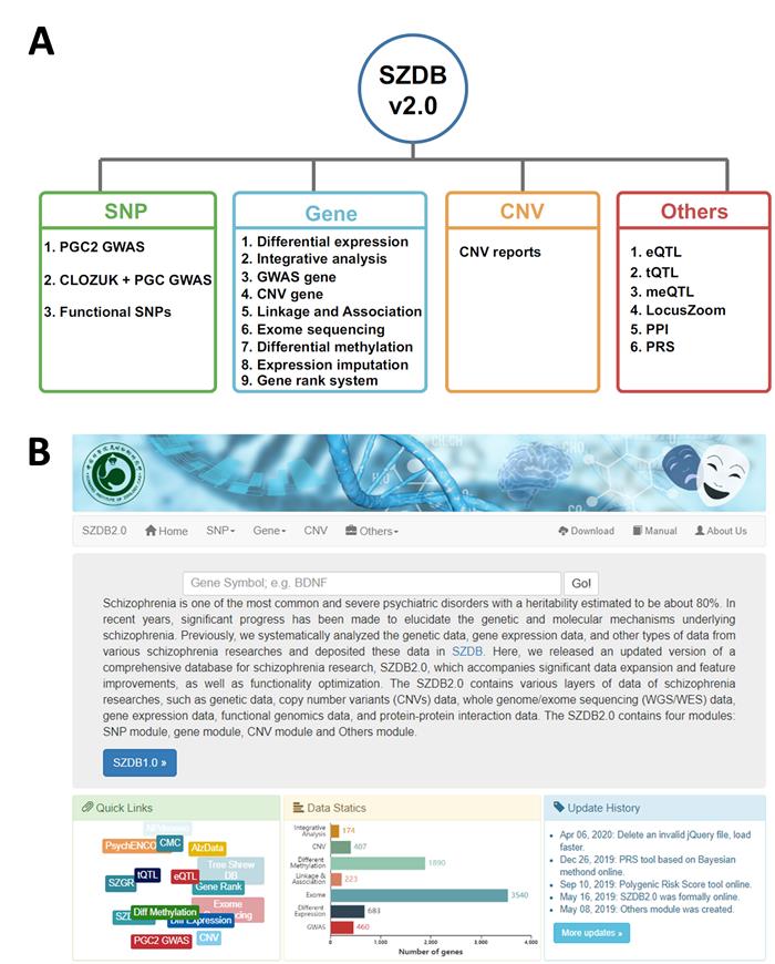 图1. 精神分裂症遗传数据库SZDB 2.0. (A)数据库主要内容;(B)数据库界面。