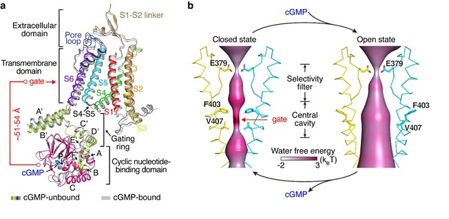 CNG通道受细胞内环核苷酸cGMP或cAMP的调控激活,可非选择性通透Na+,K+和Ca2+等阳离子,长期以来,领域普遍认为CNG通道的离子选择性过滤器(Ion selectivity filter)是开关通道的门。然而,由于尚未有同一CNG通道开放及关闭两种构象的报道,这个观点一直缺乏基于结构生物学的直接证据。此外,cGMP和cAMP如何激活CNG通道开放的分子机制也是困扰领域多年的科学谜题。