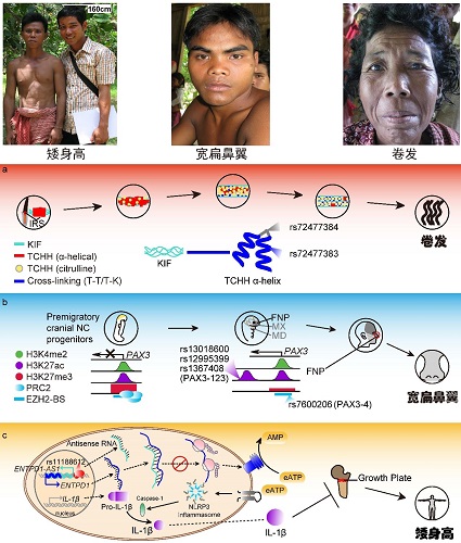为了探讨这些土著的群体历史和表型适应的分子机制与进化规律,我们与中科院北京基因组研究所(国家生物信息中心)(BIG)陈华研究组合作,对柬埔寨土著进行了全基因组测序并开展了系统的群体遗传学分析。首先,利用全基因组数据构建的群体聚类关系表明,柬埔寨土著位于东亚人群亲缘关系树较根部的位置,与其它人群的分歧明显,印证了他们是古老人群的结论。我们开发了一种T-统计量的选择分析方法,可以同时对多个群体进行基因组选择信号的分析。我们整合非洲人群、北欧人群、南欧人群和东亚汉族的数据,分析了柬埔寨土著基因组中特有选择的信号,发现了1,187个受选择的基因组区域。对这些区域中基因的功能富集分析发现了与身高、头发形态和面部轮廓等体貌表型相关的基因及其受选择的突变位点,包括与卷发表型相关的基因TCHH和TCHHL1,与鼻子形态相关的基因PAX3,以及与身高相关的基因ENTPD1-AS1。这些基因均表现为在柬埔寨土著中特有的达尔文正选择信号。TCHH和TCHHL1两个基因各有一个错义突变(改变氨基酸序列)在柬埔寨土著中富集,而这两个基因均与卷发表型有关。其他两个受选择基因(PAX3和ENTPD1-AS1)的受选择突变均位于基因的非编码区。我们进一步的细胞功能验证实验证实了PAX3和ENTPD1-AS1受选择突变位点影响基因的表达调控,从而可能最终影响鼻子形态和身高两个体貌表型。