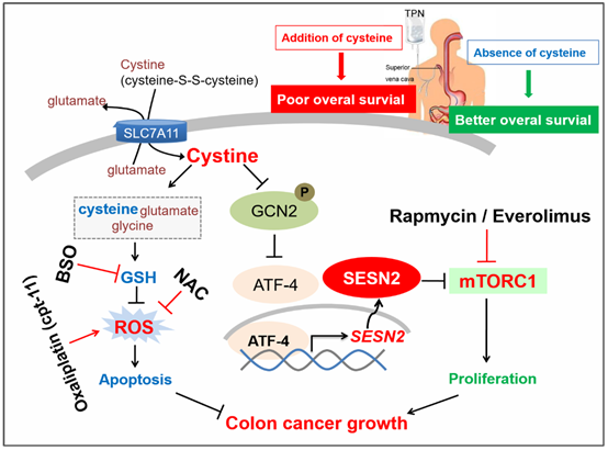 该研究通过回顾性队列研究(n=1378)发现接受了添加半胱氨酸肠外营养支持的消化道肿瘤病人,其总生存期较未添加者显著缩短(P <0.001)。一方面,胱氨酸在体外实验和免疫缺陷小鼠中均明显地促进了结肠癌的生长,其机制主要是通过抑制GCN2-ATF4轴信号转导进而抑制SESN2转录,导致mTORC1激活;mTORC1抑制剂雷帕霉素或依维莫司可以阻断胱氨酸诱导的肠癌细胞增殖。另一方面,胱氨酸会诱导结肠癌细胞对奥沙利铂和伊立替康发生耐药,其机制主要是通过合成谷胱甘肽帮助清除化疗诱导产生的活性氧,从而保护细胞免于化疗诱导的凋亡。本研究证实胱氨酸剥夺饮食可显著减缓小鼠结肠癌移植瘤的生长和增加对奥沙利铂治疗的敏感性,且不影响小鼠体重的正常增长。因此,胱氨酸可能是营养支持中影响结直肠肿瘤进展的关键氨基酸成份,限制营养制剂中胱氨酸的含量或可改善结肠直肠癌患者的生存。