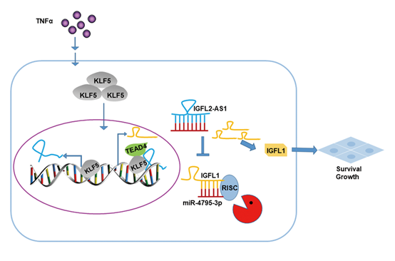肿瘤生物学实验室一直致力于对转录因子KLF5的研究。团队通过使用KLF5的染色质免疫共沉淀测序技术以及转录组测序技术发现了KLF5调控的新的靶基因,IGFL2-AS1和IGFL1。通过双荧光素酶报告基因实验以及染色质免疫共沉淀实验证实KLF5确实上调IGFL2-AS1以及IGFL1的转录。在炎症因子TNFα的刺激下,KLF5一方面直接诱导IGFL1转录,另外一方面通过下游靶基因IGFL2-AS1上调IGFL1的表达。IGFL2-AS1在细胞质以及细胞核内均有分布。RNA免疫沉淀实验以及RNA的拉取实验充分证明IGFL2-AS1同时与KLF5以及TEAD4存在相互作用,促进IGFL1的转录。另外,细胞质中的IGFL2-AS1通过遵循靶向microRNA的降解机制(TDMD)降解miR-4795-3p从而正向调IGFL1。通过体内以及体外实验证实IGFL2-AS1以及IGFL1是癌基因。同时,回复实验证实KLF5通过IGFL2-AS1和IGFL1发挥促癌功能。最后,通过检测以及分析临床样本中KLF5,IGFL2-AS1以及IGFL1的表达证明三者的表达相关性,IGFL1高表达与三阴性乳腺癌病人的预后呈负相关。