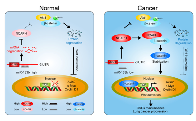 2021年7月7日,中科院昆明动物研究所陈勇彬、杨翠萍研究员课题组和昆明医科大学第一附属医院段勇教授团队在《Signal transduction and targeted therapy》杂志在线发表了题为“miR-133b targets NCAPH to promote β-catenin degradation and reduce cancer stem cell maintenance in non-small cell lung cancer”的研究论文。该研究发现miR-133b在非小细胞肺癌患者的肿瘤组织和外周血的血清中,相比正常人群低表达;而miR-133b靶向调控的凝缩蛋白家族成员NCAPH则高表达。NCAPH高表达,抑制β-catenin蛋白的泛素化修饰和降解过程,进而在肿瘤干细胞中持续激活Wnt信号通路,促进非小细胞肺癌的进展和化疗耐受。