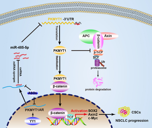陈勇彬课题组前期通过整合组学的分析方法,筛选得到在非小细胞肺癌(NSCLC)肿瘤干细胞和顺铂化疗耐药细胞株中高表达的人类特异长链非编码RNA(lncRNA),后根据该lncRNA能调控下游靶基因PKMYT1在NSCLC中的功能,给其命名为PKMYT1 associated lncRNA (PKMYT1AR)。研究结果显示,PKMYT1AR在NSCLC受转录因子YY1调控,而YY1受低氧微环境诱导在NSCLC中高表达。临床相关性分析结果显示,PKMYT1AR在NSCLC的肿瘤组织与患者外周血的血清样本中都高表达,其高表达与肿瘤患者的不良预后显著正相关。体内和体外实验研究发现,敲低PKMYT1AR表达能够显著抑制肿瘤细胞的生长。进一步研究发现PKMYT1AR能够促进肺癌干细胞的自我更新能力,提高肿瘤细胞对顺铂化疗药物的耐药性。分子机制研究表明,PKMYT1AR主要定位在细胞质当中,其以分子海绵吸附效应(miRNA sponge)作用于miRNA-485-5p,上调miR-485-5p下游靶基因PKMYT1(细胞周期调控蛋白)的表达。PKMYT1促进肿瘤细胞增殖,并通过与E3泛素连接酶β-TrCP1竞争性地与Wnt信号通路下游转录因子β-catenin蛋白结合,稳定β-catenin蛋白表达,激活Wnt信号通路和肿瘤干细胞,进而推动NSCLC的恶性进展。研究团队设计了靶向抑制PKMYT1AR表达的ASOs(反义寡核苷酸),并鉴定其能够显著抑制肿瘤细胞的体内外生长和迁移能力,提示PKMYT1AR未来可以被作为一个有潜力的NSCLC临床诊断和治疗的新靶点。