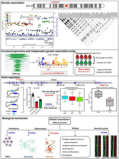 累积的证据表明精神分裂症可能是由于神经发育异常导致的。因此,研究人员进一步研究了Sfmbt1在神经系统发育中的作用,发现Sfmbt1调控神经干细胞的增殖和分化。同时转录组数据表明Sfmbt1调控与神经功能和神经系统疾病相关的通路。树突棘密度分析也表明Sfmbt1调控树突棘的形态发生和密度。这些证据支持Sfmbt1可能通过影响神经发育介导精神分裂症易感。最后,我们在中国人群中独立证实rs2535629在中国人群中也与精神分裂症显著相关。这项研究在分子水平上阐明了精神分裂症风险变异rs2535629对SFMBT1的调控机制,并提供了风险变异与精神分裂症病因之间的机制联系。