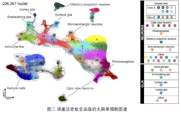 通过比较蚂蚁与果蝇的大脑细胞组成的差异发现,比起果蝇,法老蚁中负责高级认知功能的蘑菇体细胞的丰度显著提高了,其功能也发生了明显的多样性分化。跳镰猛蚁和蜜蜂中,蘑菇体细胞相比果蝇也同样发生了明显的扩张及分化。这提示了昆虫社会性的出现是驱动大脑高级认知中枢扩张及多样性分化的重要力量,当然这一观察还需基于严格的系统发育关系在多物种比较中加以佐证。