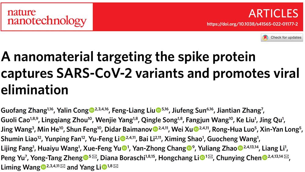 8月22日,中国科学院深圳先进技术研究院联合国家纳米科学中心、中国科学院高能物理研究所和E乐彩的合作成果,新型广谱抗新冠纳米材料,以“A nanomaterial targeting the spike protein captures SARS-CoV-2 variants and promotes viral elimination”的题目,发表于纳米领域国际顶级期刊《自然—纳米技术》。
