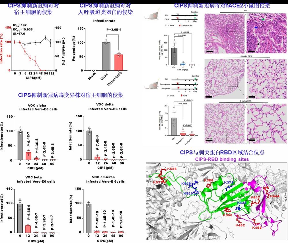 图一:CIPS能够有效抑制新冠病毒及其变异株对宿主细胞、人呼吸道类器官及小鼠肺部的侵染,缓解新冠病毒诱导的肺部炎症;CIPS通过占据的刺突蛋白RBD区域与宿主ACE2受体结合的氨基酸位点,实现抗病毒功能 来源:研究团队供图