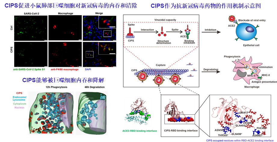 在细胞、类器官和小鼠动物模型上的实验表明,CIPS结合新冠病毒后,不仅能够高效地抑制病毒对宿主细胞的侵染,还可促进巨噬细胞对病毒的清除。巨噬细胞是机体免疫系统中发挥重要功能的效应细胞,能够高效清除外源入侵物。CIPS作为外源物质,在肺部能被巨噬细胞识别、捕获并降解。同时,CIPS作为一种可降解二维纳米材料,能够充当“胶水”或“陷阱”,特异性粘附新冠病毒表面的刺突蛋白,捕获并附着病毒颗粒形成病毒-CIPS复合物,引起巨噬细胞对病毒-CIPS复合物的摄取、降解和清除,诱发后续抗病毒免疫反应,提高抗病毒效率。
