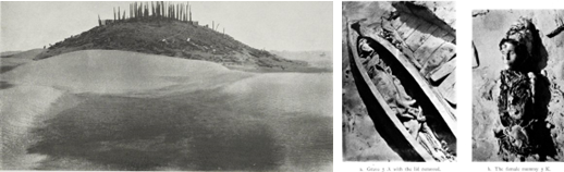 图1. 小河墓地全景、船形棺、出土干尸(摘自《新疆考古研究》,1939年)