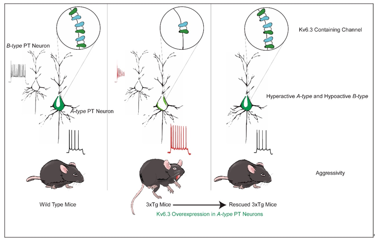 此外,研究人员还通过对比两类神经元转录组学的差异,将A-type PT神经元电生理异常的机制定位于电压门控钾离子通道Kv6.3,通过免疫荧光、蛋白免疫印迹、单细胞qPCR等手段,确定了此类神经元Kv6.3表达的降低,并通过Kv6.3的过表达,逆转了模型小鼠A-type PT神经元的电生理异常以及攻击行为的增加。这一研究对AD神经精神症状的发生机制提供了新的见解,同时也对PFC神经元的分类提供了新的依据。