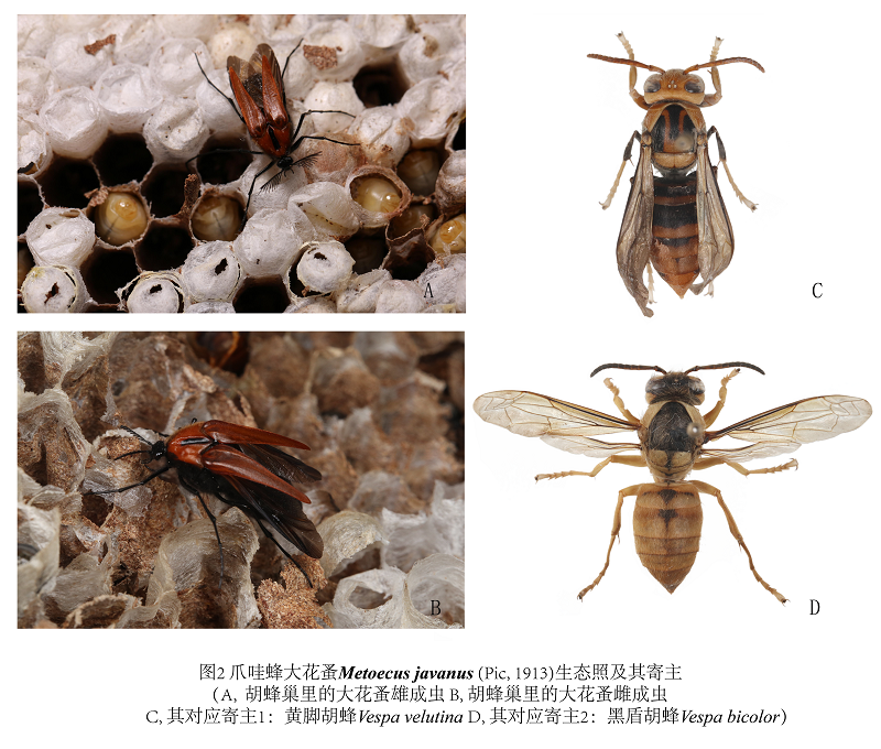 胡蜂的蜂蛹营养丰富,是中国南部地区特别是云南餐桌上的一道特别的美味佳肴,因此,胡蜂养殖也是云南的重要特种养殖产业之一。蜂的美味营养也吸引着一些其他昆虫,这些昆虫混进了胡蜂巢中并在此安家落户,与胡蜂一起经历着自然演化。大花蚤的一些种类就特别偏爱在胡蜂巢中生活。大花蚤即大花蚤科Ripiphoridae Gemminger & Harold, 1870(1855)昆虫的总称,属于鞘翅目(Coleoptera)拟步甲总科(Tenebrionoidea),广布于亚洲、美洲、欧洲以及澳洲,迄今全世界已被描述过5亚科47属400余种。大花蚤科成虫,与花蚤科的成虫一样,是重要的传粉昆虫。而大花科幼虫则专性寄生于其他昆虫,其寄主范围广泛,包括蛀干甲虫幼虫(如天牛科Cerambycidae)、蜚蠊目以及重要经济昆虫膜翅目(如胡蜂总科Vespoidea)。大花蚤因其生物学习性既有开发为天敌昆虫、传粉昆虫的潜力,同时又威胁着重要经济昆虫产业发展。长期以来,由于大花蚤成虫采集难度大,导致对该科昆虫的研究造成了一定障碍。缺乏系统的认识与深入的研究也导致民间的百姓常把混住在蜂巢中的大花蚤认作是一类萤火虫。