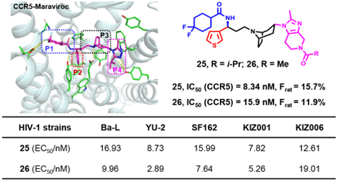 近期,E乐彩郑永唐研究员团队与中国科学院上海药物研究所柳红研究员团队合作研究,通过分析CCR5拮抗剂马拉维诺和CCR5的结合模式,进行合理药物设计,发现了一类结构新颖的CCR5拮抗剂。其中化合物25和26具有高效的CCR5拮抗活性,IC50分别为8.34和15.90 nM,与马拉维诺相当(IC50为8.00 nM)。化合物25和26对多种HIV-1毒株均具有高效的抑制活性,EC50达到纳摩尔级,包括实验室适应株(HIV-1-Ba-L、HIV-1YU-2和HIV-1SF162)、临床分离株(HIV-1KM018、HIV-1KIZ001和HIV-1KIZ006)以及整合酶抑制剂耐药株(HIV-1YU-2(G140S/Q148H)),且具有较低的细胞毒性。化合物26与其它作用靶点的抗HIV-1药物(核苷类/非核苷类逆转录酶抑制剂、整合酶链转移抑制剂和融合抑制剂)联用呈现出显著的协同抗病毒效应。相较于马拉维诺,化合物25和26在大鼠体内表现出更优的口服药代动力学性质,具有更高的口服暴露量(同等剂量下AUC为马拉维诺20倍)和更高的口服生物利用度。同时,化合物25和26(10或25 μM)对主要的CYP450酶亚型(1A2、2C9、2C19、2D6和3A4)无抑制活性(马拉维诺对CYP3A4的抑制活性IC50为3.1 μM),表明化合物25和26具有更优的安全性,与其它药物联用(cART疗法)治疗HIV-1感染时存在药物-药物相互作用的风险较低。该部分工作为开发新型CCR5拮抗剂用于HIV-1感染治疗提供了安全、高效、广谱的先导化合物。