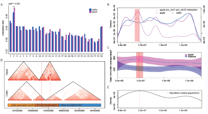 牛属物种中广泛存在着罗伯逊易位,其中Rob(2;28)(祖先2号染色体和28号染色体易位融合)在独龙牛中已固定下来。独龙牛是一种半野生半家养的珍稀牛种,栖息在高山陡坡环境中,具有十分优秀的攀爬能力,其肌纤维以细长著称,因与当地黄牛杂交频繁,其种质资源受到了严重威胁。其独特的生活环境和频繁的杂交历史为研究核型变化和罗伯逊易位提供了理想的研究材料。