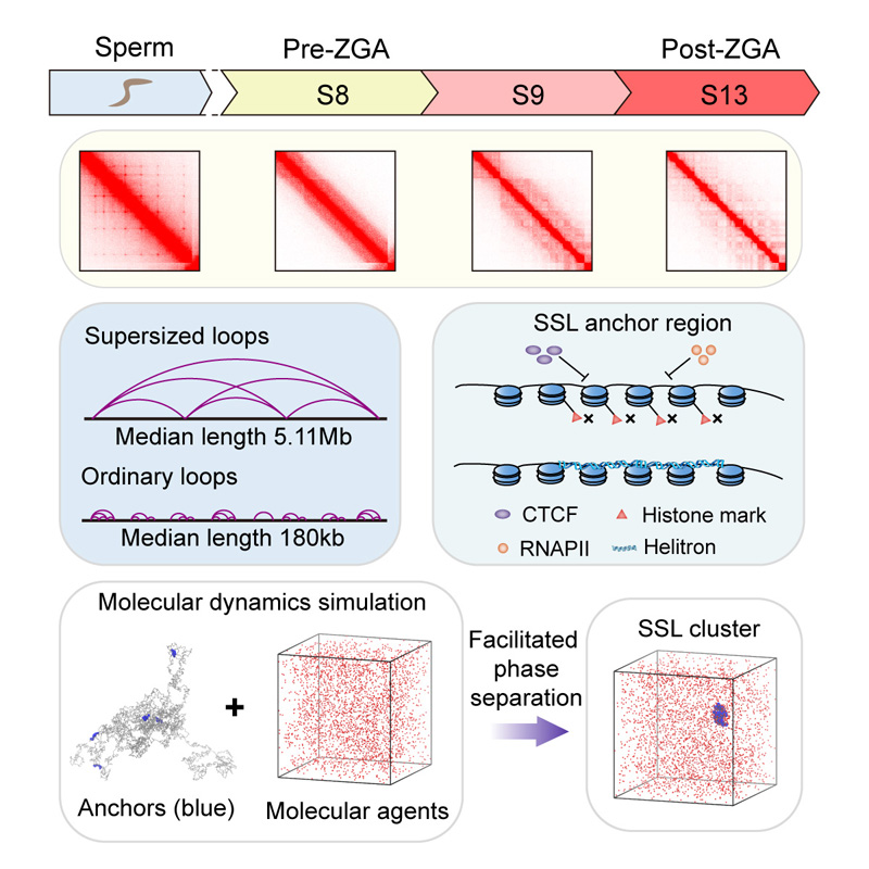 研究者比较发现脊椎动物精子的染色质三维图谱具有高度的物种特异性。通过添加内参绘制热带爪蛙成熟精子的染色质三维图谱后,研究人员发现在热带爪蛙成熟精子中存在144个SSLs,这些SSLs的中位值在5.11Mb,是热带爪蛙大脑细胞染色质环中位值的28倍。研究者进一步揭示这些SSLs锚定点存在于染色质非开放区,不富集染色质结构蛋白CTCF,转录复合体RNAPII,PRC1/2复合物以及多种组蛋白修饰(H3K4me3,H3K27ac,H3K27me3,H3K9me2)。研究者通过对基因组不同注释区域进行分析发现,几乎所有的SSLs锚定点都与II类DNA转座子Helitrons重叠。进一步通过分子动力学模拟表明SSL簇可能是通过某些分子介导的相分离/凝结过程形成的。通过与课题组前期发表的热带爪蛙胚胎发育时期染色质三维图谱相对比(4),发现大部分SSLs锚定点对应于胚胎时期或组织细胞中TAD结构的边界。