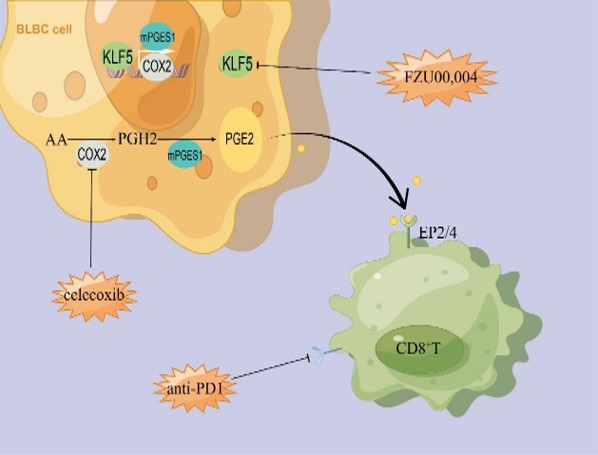 2023年2月21日,《Theranostics》期刊在线发表了重点实验室陈策实课题组题为“KLF5 inhibition potentiates anti-PD1 efficacy by enhancing CD8+ T-cell-dependent antitumor immunity” 的研究论文。该研究发现Krüppel样因子5(KLF5)促进环氧化酶2(COX2)的转录并增加前列腺素 E2(PGE2)的合成,PGE2结合CD8+ T细胞表面的EP2和EP4受体从而抑制CD8+ T细胞的功能,最终形成抑制性的免疫微环境;抑制KLF5促进CD8+ T细胞浸润,诱导记忆T细胞的形成,强化PD1单抗的疗效。